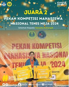 Dekanat dan segenap civitas akademika Fakultas Ilmu Keolahragaan dan Kesehatan Universitas Negeri Jakarta mengucapkan Selamat dan Sukses kepada Natasha Kahanjak yang telah berhasil menjadi Juara 2 Kategori Single Putri Pekan Kompetisi Mahasiswa Nasional Tenis Meja 2024 Terus berjuang meraih prestasi, menggapai mimpi, dan menjadi motivasi serta inspirasi bagi yang lain 💪🔥